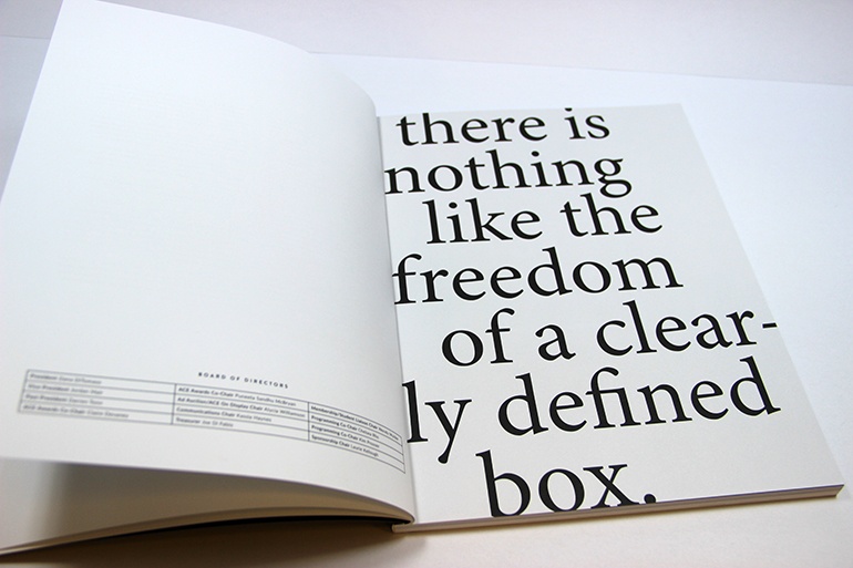 This year’s winners book had a clean, refined layout in order to let the winning work speak for itself. However, we did take advantage of different techniques in order to give the book a sleek, elemental feel. The book was printed on 100lb Astrolite Bright White cover and Domtar 80lb Lynx Opaque Smooth text by McCallum Printing Group. Separating different sections, we used full floods of color and on the cover we did a double hit of black ink in order to achieve the deep, rich black we were looking for. We also did an aqueous, uncoated coating throughout the piece and embossed both the front and back covers. The final piece was 9” x 11.75” and was 120 pages + cover, perfect bound. The binding was done by Atlas Book Bindery and the cover embossing was done by The Finish Line.