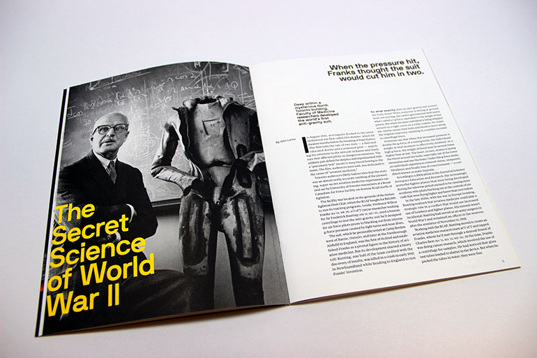 With the design of UofTMed, we wanted to make something that would transcend style trends as well as withstand actual wear and tear of being shared between many people. It’s not your typical throw-away magazine, and we do not want the magazine to be perceived as a typical bland, flat corporate PR piece. As such, we commissioned (and sometimes created) art and photography that is witty, surprising and often tongue-in-cheek — while still being meaningful to the stories they illustrate.