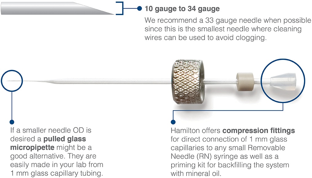 Fill out the form at the top of the page to download the Syringe and I Needle Reference Guide to earn about all of Hamilton's available gauge sizes or the Glass Needles and PEEK Tubing Connectors Datasheet to learn more about pulled glass micropipettes.
